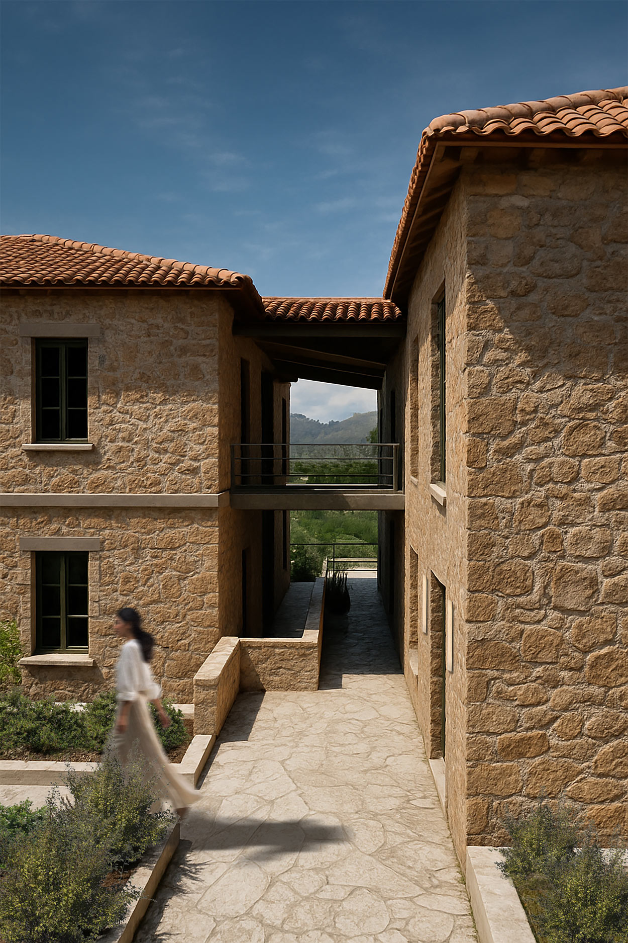 Locally sourced stone for the walls and clay tiles for the sloped roofs help the building blend seamlessly with the natural surroundings. Wooden shutters with olive green accents enhance the warmth of the aesthetic, while the stone-paved courtyard adds rustic charm. The design preserves traditional elements while introducing a contemporary suspended walkway that connects the house’s volumes.